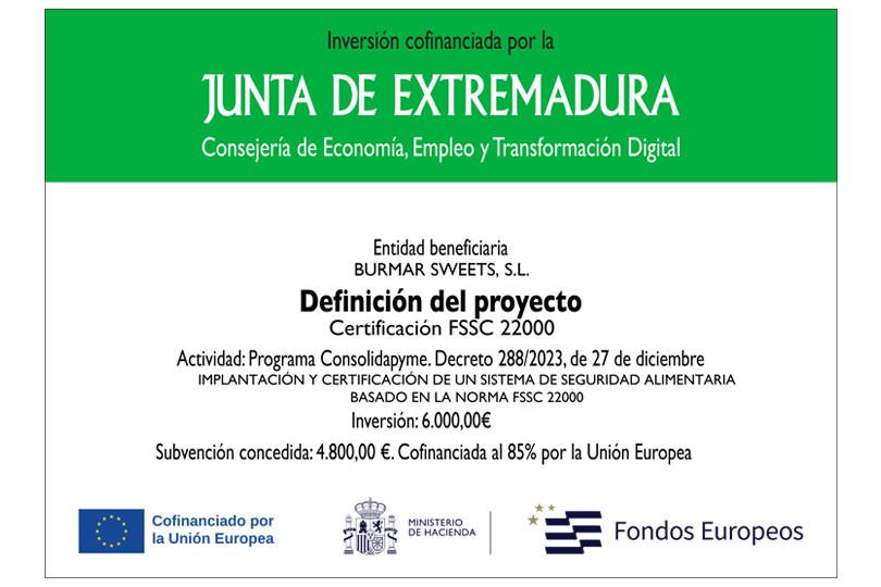 BURMAR SWEETS, S.L. ha ejecutado el proyecto de implantación y certificación FSSC 22000 en su planta de Talarrubias, con el objetivo de reforzar la seguridad alimentaria, mejorar la calidad y la trazabilidad de sus procesos, y consolidar su competitividad en mercados internacionales. La actuación ha culminado con la obtención del certificado FSSC 22000 emitido por AENOR.